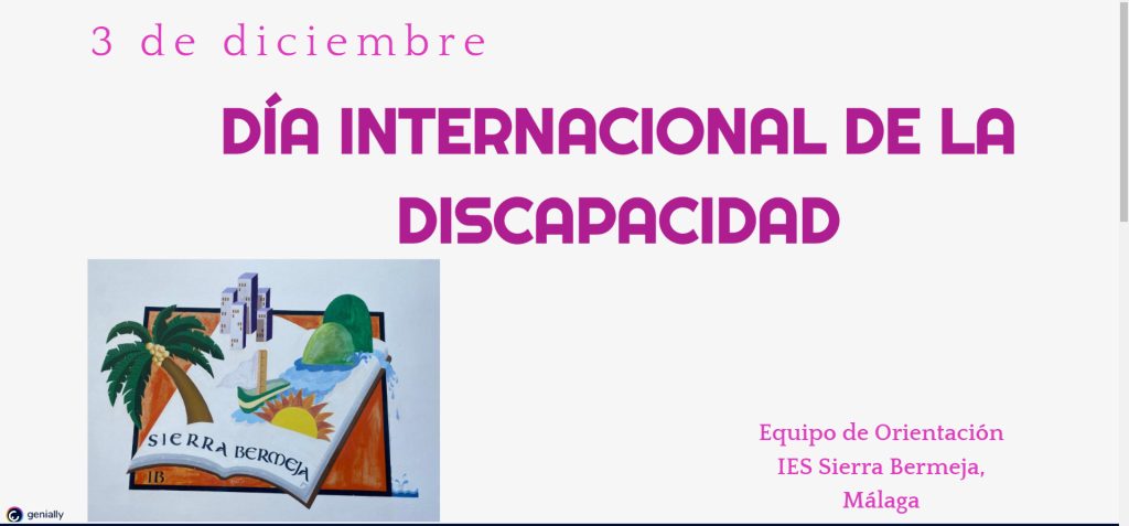 Presentación sobre discapacidad y lenguaje inclusivo Con motivo del 3 de Diciembre, Día Internacional de las Personas con Discapacidad, el equipo de Orientación de nuestro IES ha preparado esta presentación sobre el uso del lenguaje inclusivo y otros datos interesantes dentro del ámbito de la discapacidad. Buscador Buscar: Categorías Blog Departamento de Servicios Planes y [...]
