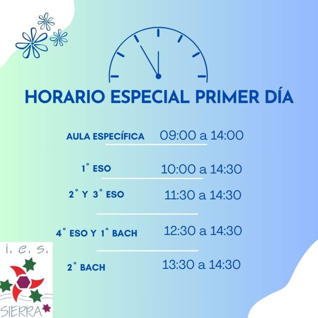 El lunes 15 de septiembre comienzan las clases. Aquí podéis ver el horario especial de entrada y salida. A partir del martes, nuestro horario será de 0 a 14.30 en el turno de mañana y de 15:30 a 21.45 en el turno de tarde. ¡Os esperamos!