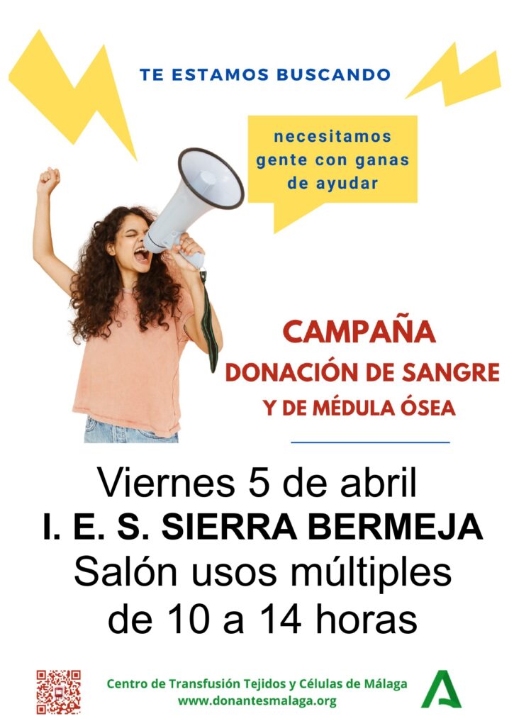 Tenemos una nueva oportunidad para donar sangre en el IES Sierra Bermeja. El próximo viernes 5 de abril cualquier persona mayor de edad puede acercarse al instituto para donar sangre e incluso inscribirse en el programa de donación de médula ósea. ¡Anímate y participa!. El Centro de Transfusión, Tejidos y Células de Málaga agradece tu [...]