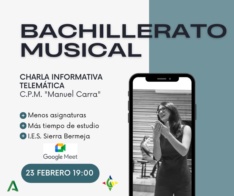 El próximo 23 de febrero a las 19:00 h. se realizará una reunión telemática para informar sobre el bachillerato musical y las novedades normativas para esta modalidad de matriculación de cara al próximo curso 2023/24. En la reunión estarán tanto representantes del Conservatorio Manuel Carra como el Director del IES Sierra Bermeja, D. Antonio Gálvez [...]